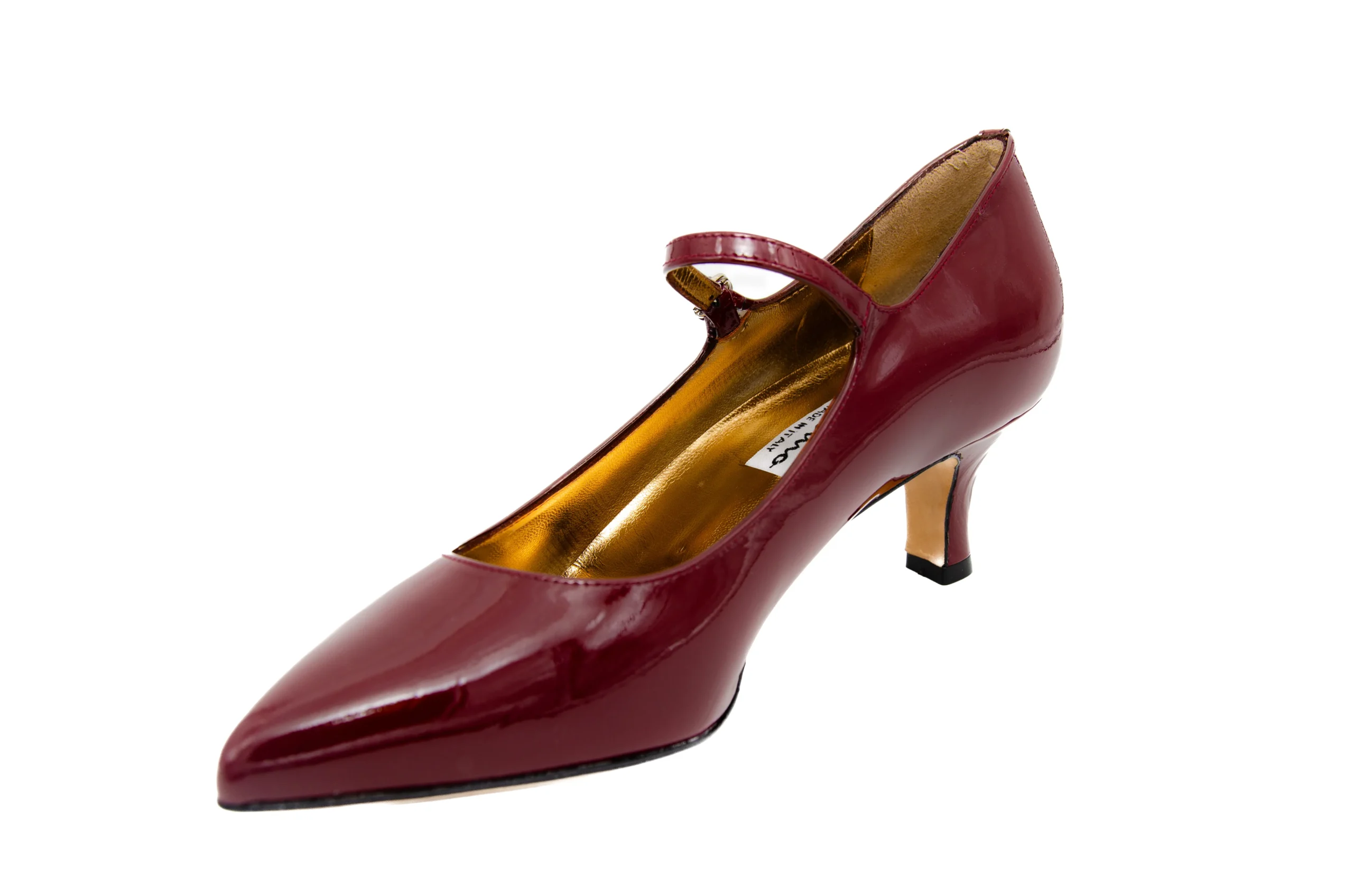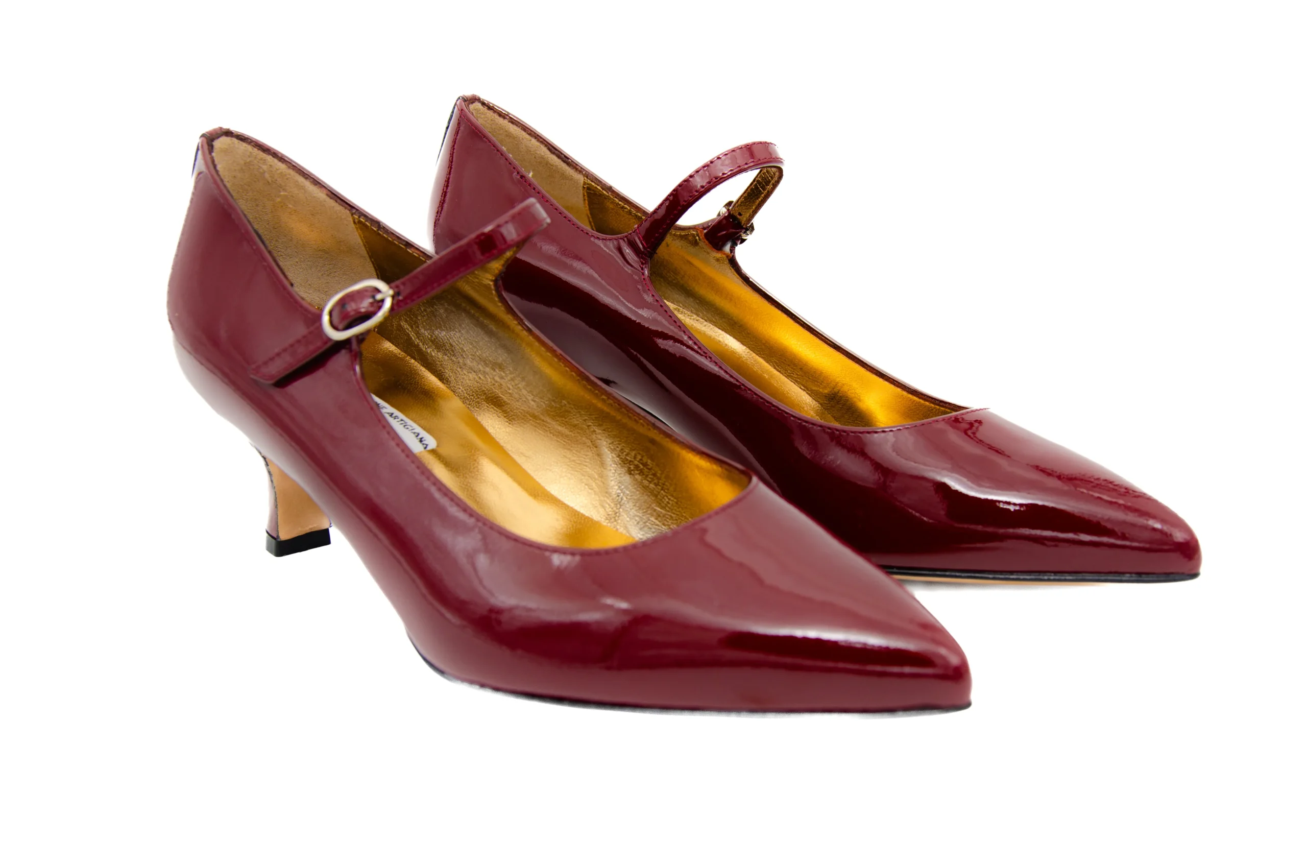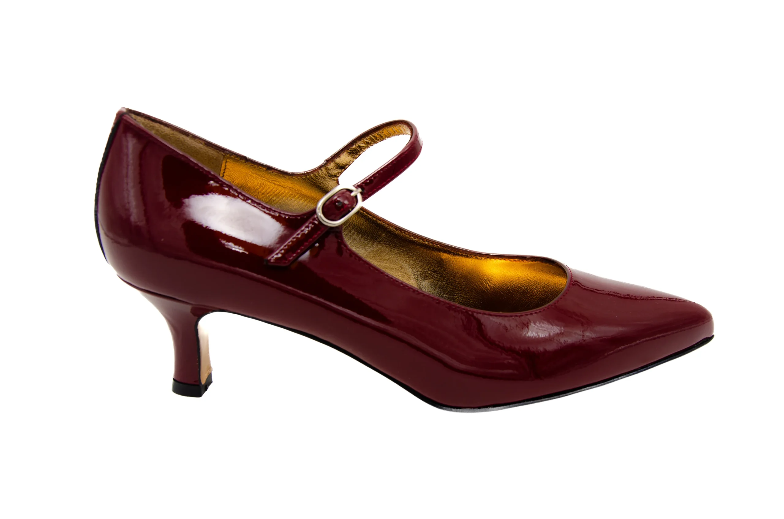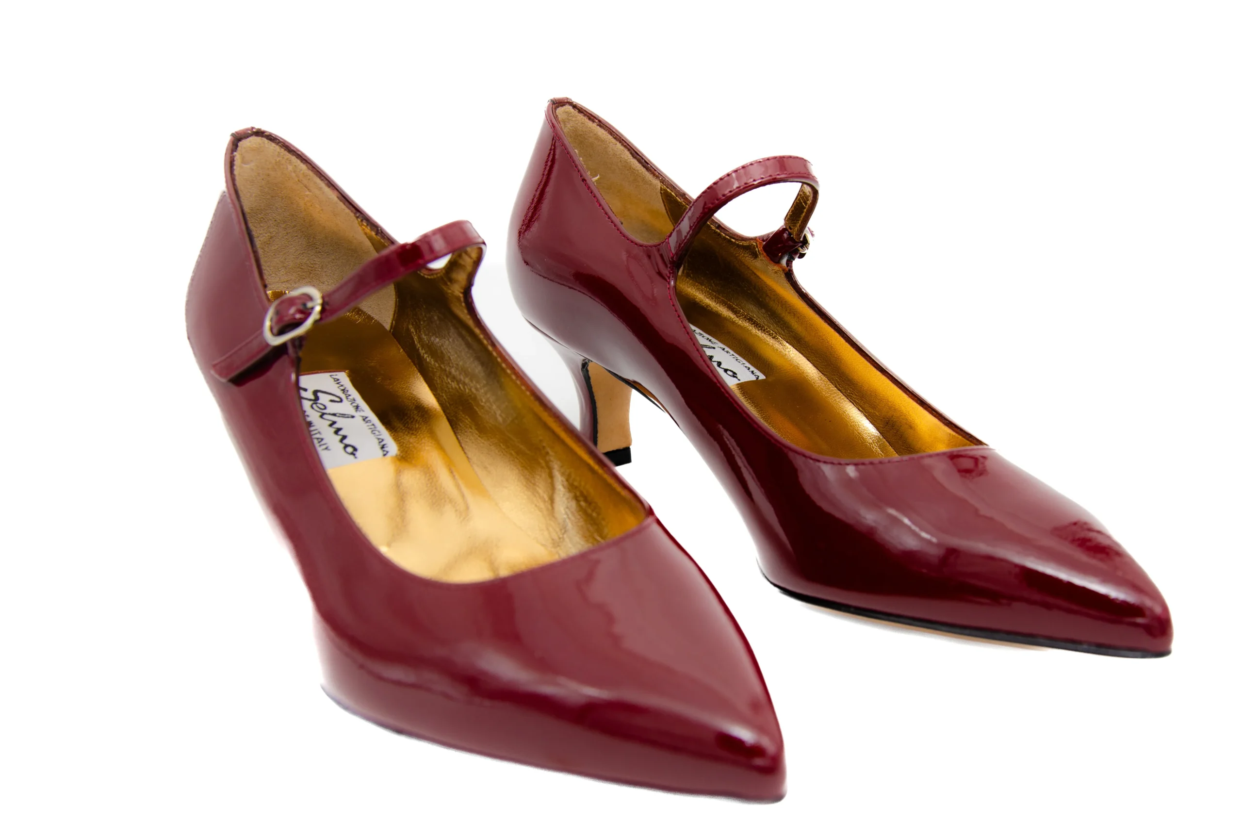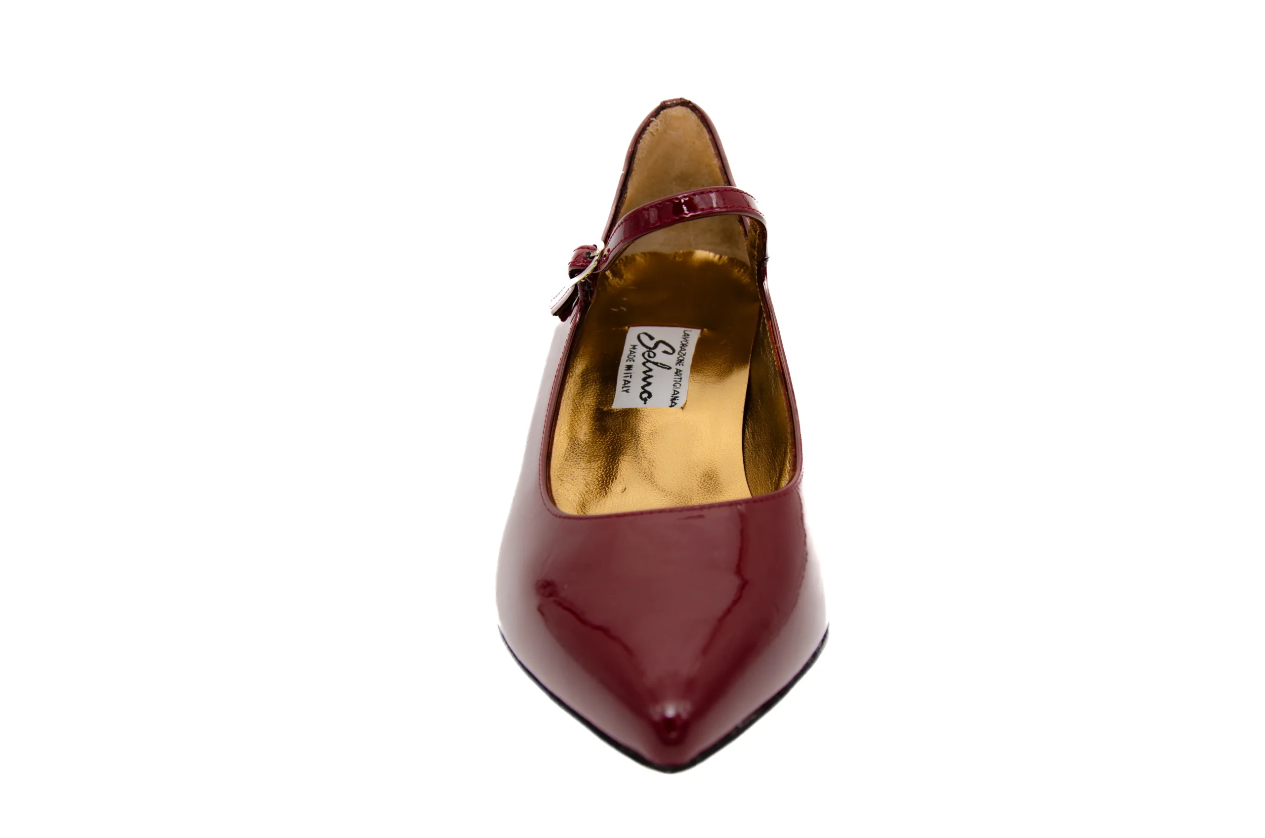 Mary Jane sofisticata in vitello verniciato bordò, caratterizzata da un tacco in pelle da 5.0 cm e una suola artigianale in cuoio.